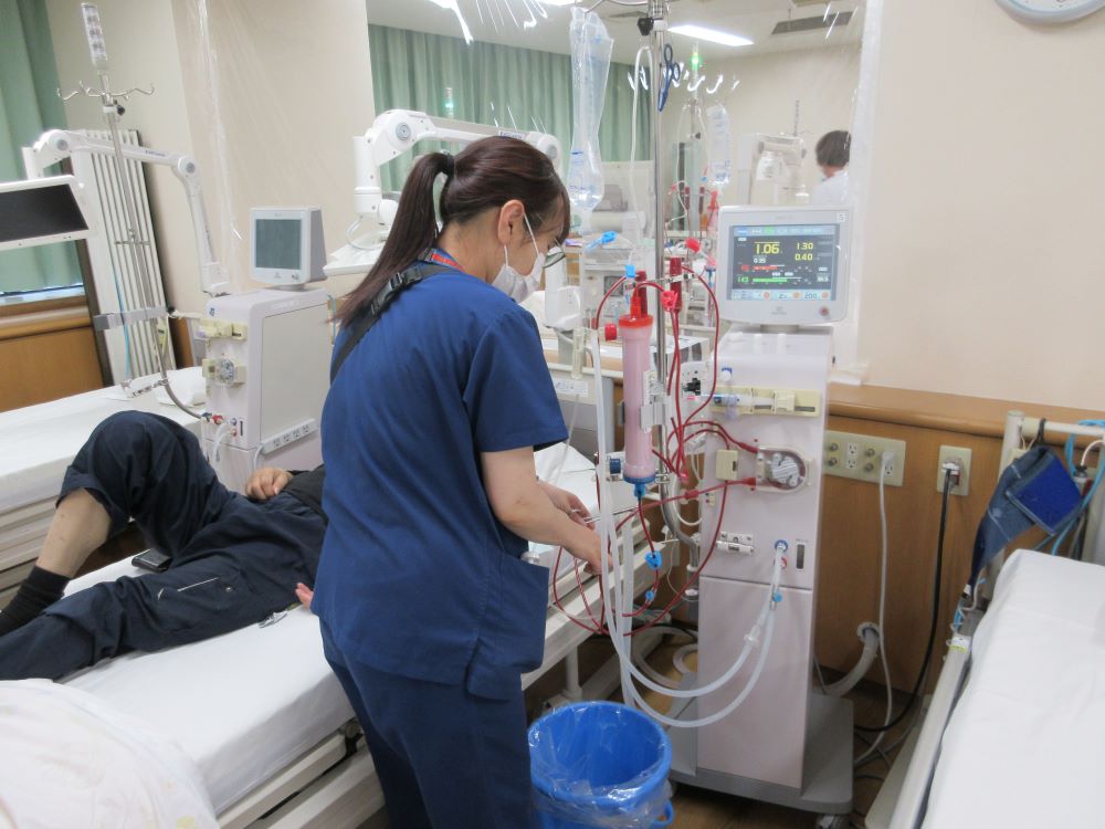 当院腎センターは総合病院であることを活かし、外来透析患者様の対応だけではなく、クリニックでは対応の難しい重症患者様や、手術を控えた患者様の対応も行っています。透析中に起こりうる様々な問題に対し、脳神経外科や循環器内科、血管外科など専門の医師の診察をすぐに受けることが出来るため、患者様はもちろんスタッフも安心して働くことが出来ます。透析は特殊な技術と知識を要しますが、業者主催の勉強会を多数企画しており、最新の知識を学べます。ベテランのスタッフが多く配置されており、手厚く丁寧な指導を行っています。また経験のある看護師や当院である程度経験を積んだ看護師には、透析技術認定士など専門資格の取得にも協力的な体勢を整えています。