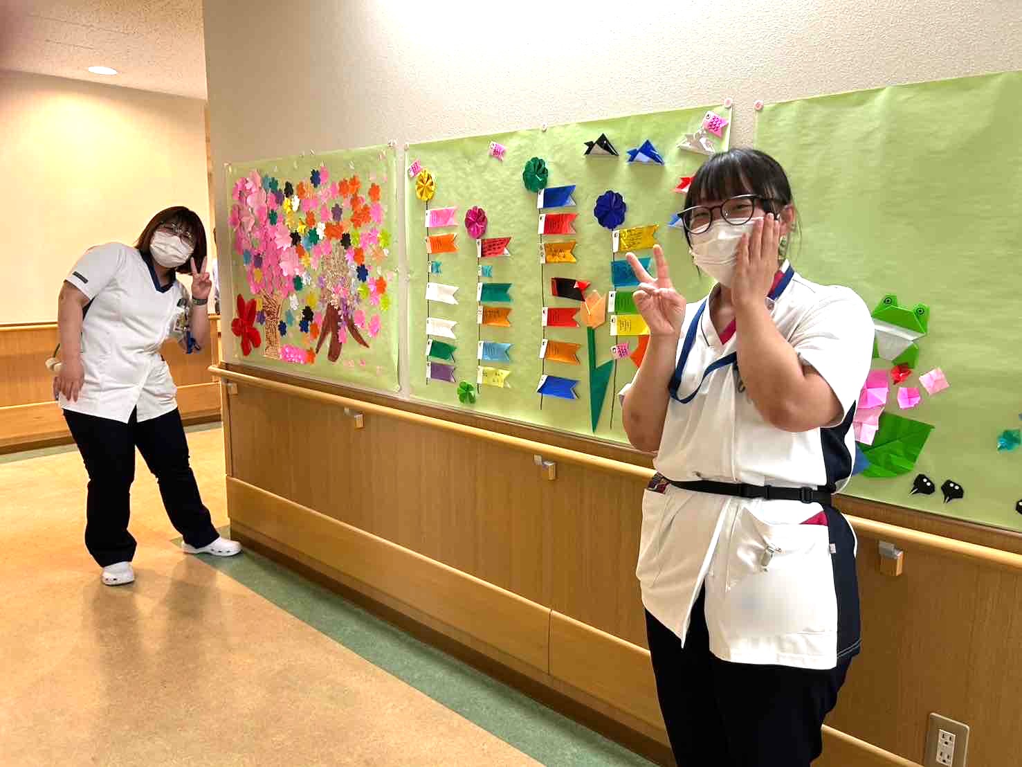 回復期病棟はリハビリが治療の中心なので全身状態が落ち着いている患者さんが多く、急性期の病棟に比べ穏やかな病棟です。病棟では看護師と看護補助者が協働して患者さんのケアにあたっています。長期のリハビリ入院は患者さんにとっては身体的にも精神的にも負担が大きく、意欲的にリハビリを続けていくのが難しくなることもあります。そのため、できるだけ入院生活を楽しく過ごせるようにリハビリの一環として患者さんと一緒に折り紙で季節に関連する飾りを作ったり、レクリエーションを行うなどの取り組みも行っています。レクリエーションに関してはスタッフも楽しみながら行っており「次は何をつくろうか」と業務を忘れてしまいそうになることもあります。日々患者さんができるだけ楽しくリハビリに取り組んでもらえるようにサポートしたいとスタッフ一同取り組んでいます。